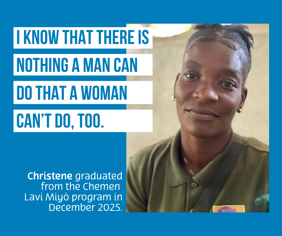 Christene graduated from the Chemen Lavi Miyò (CLM) program in December 2025. She was selected as one of the speakers at the graduation ceremony; her testimony about repairing her home demonstrated two important parts of the program - creating a safe space for her family, and equally important, knowing you are strong enough to do it independent of a man.
